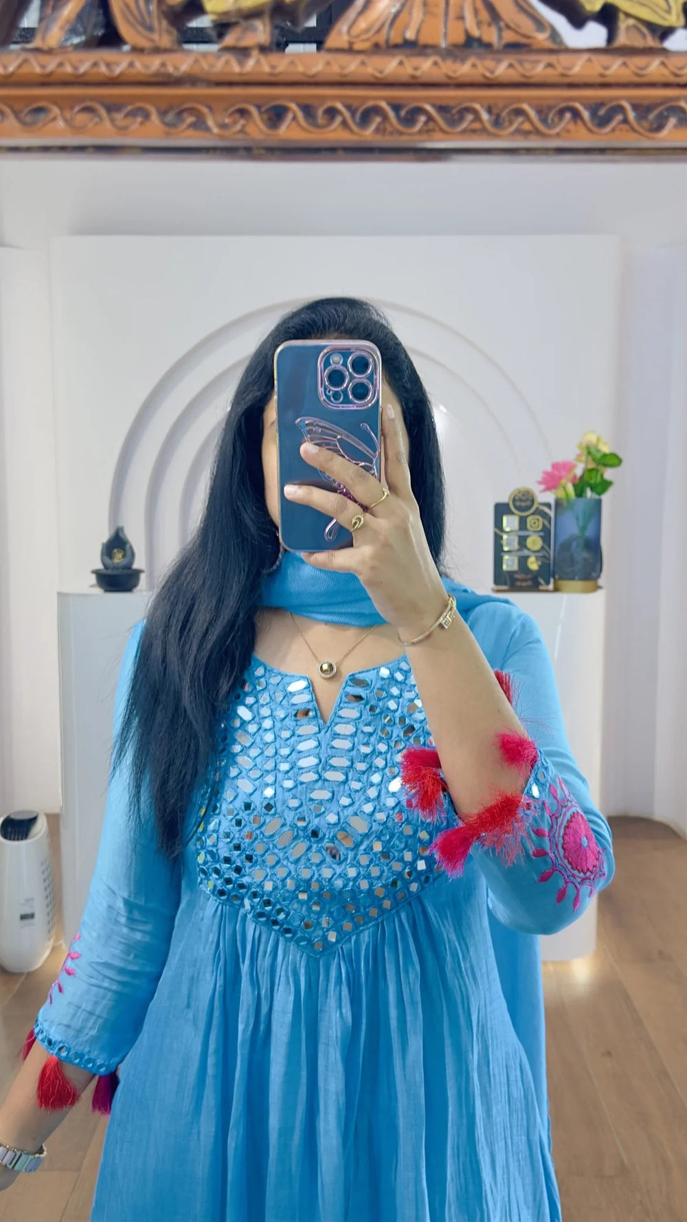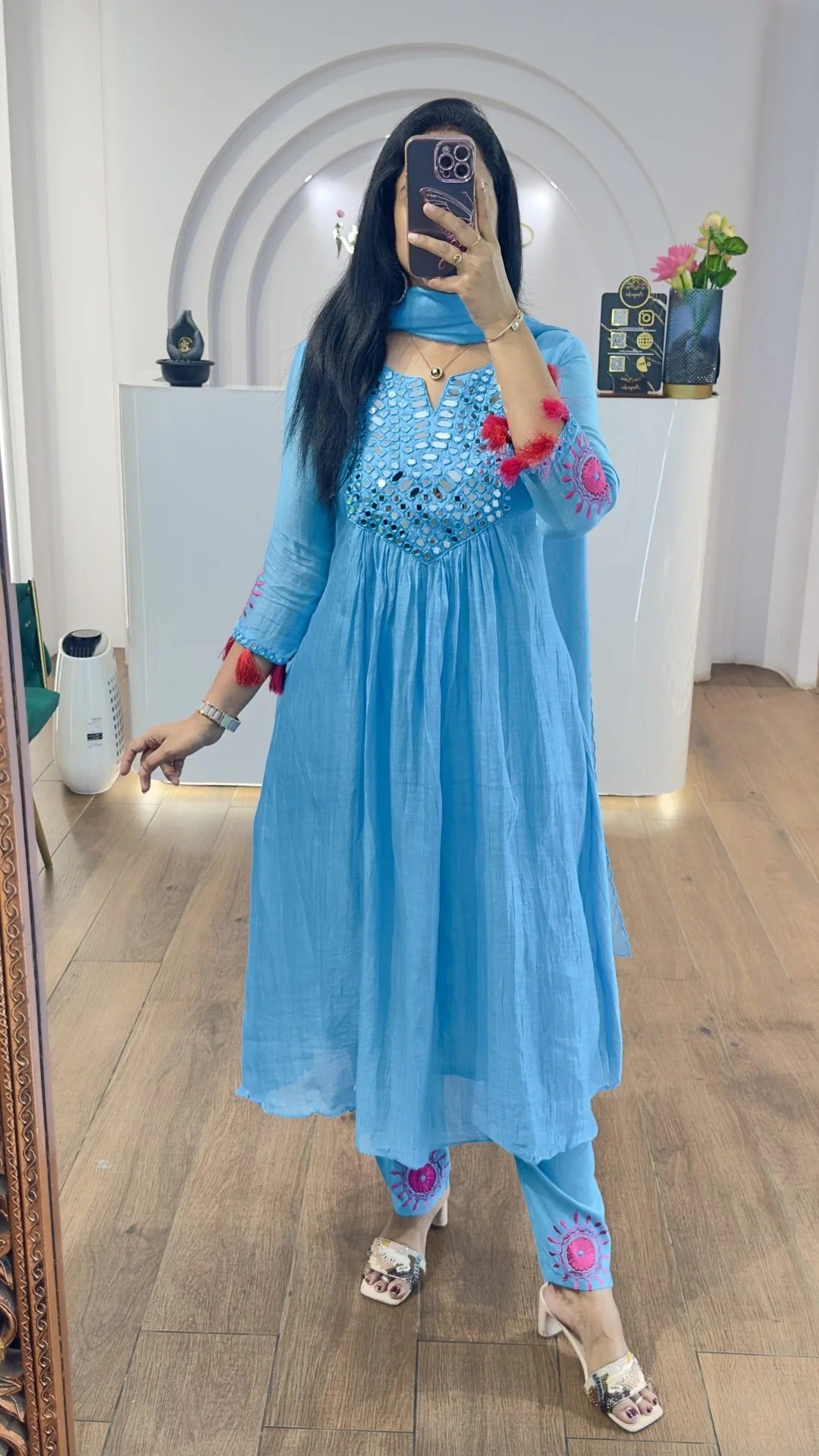 Sky Blue Mul Chanderi Mirrors Handwork Suit Set