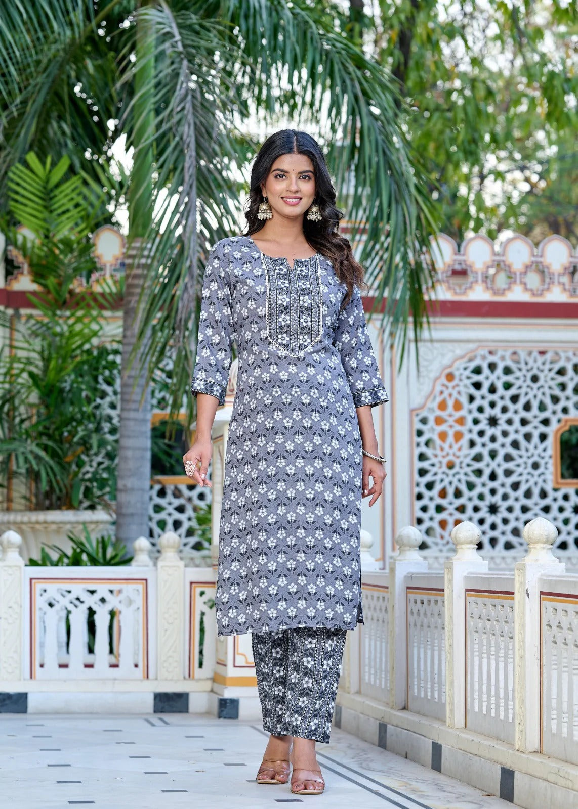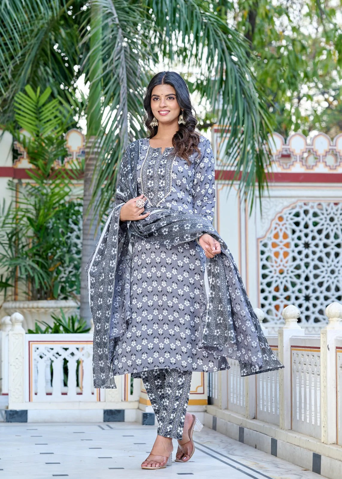 Crafted from soft, breathable premium rayon fabric, this minimalistic ensemble features a sleek gray base adorned with subtle yet stylish detailing, making it perfect for both office wear and casual outings. The straight kurta is paired with a matching pant and a coordinating lightweight dupatta, offering a balanced blend of comfort and charm.