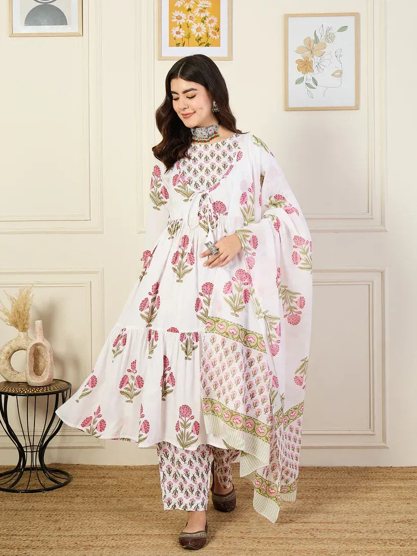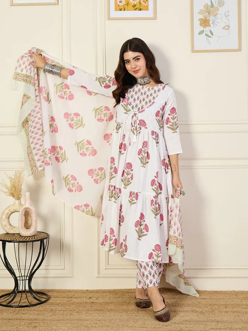 Step into the freshness of floral charm with our Gulbagh Tiered Anarkali Set. Crafted from breathable viscose fabric, this white ensemble is beautifully adorned with hand-block-style floral prints in pink and green tones. The tiered silhouette of the kurta adds a touch of playful elegance, while the straight-fit pants and printed dupatta complete the look with ethnic finesse.