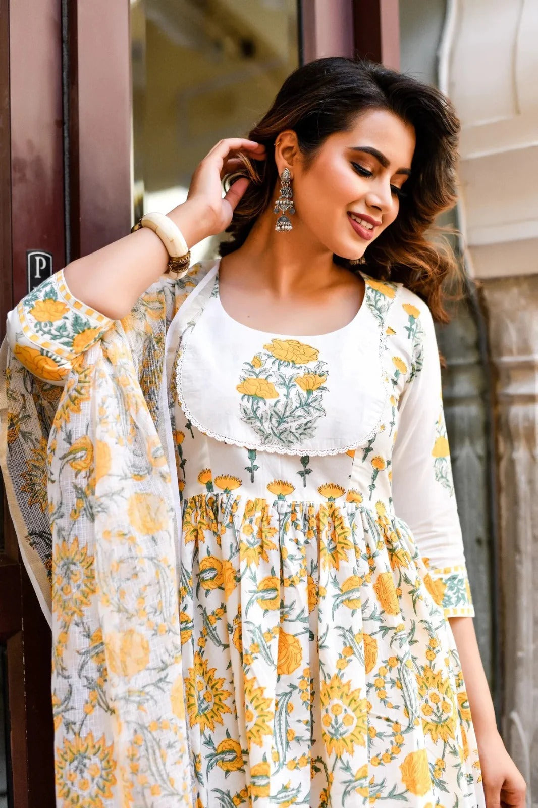 Print: Vibrant yellow and green floral motifs on a white base, with an embroidered yoke