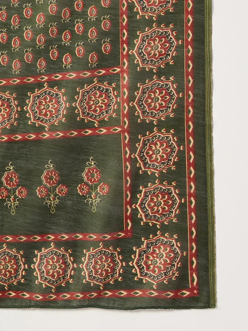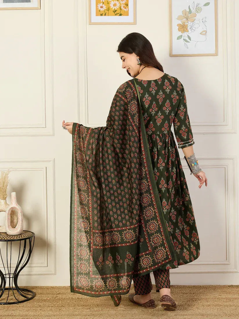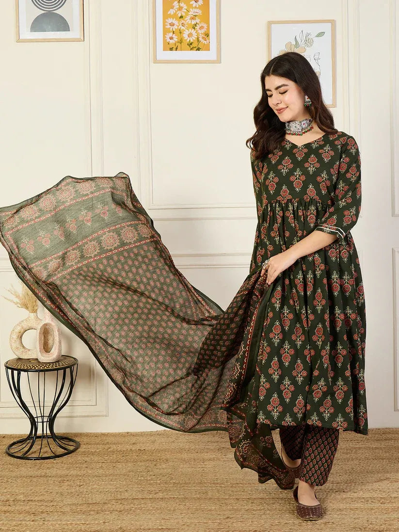 Embrace earthy elegance with the Moss Charm Anarkali Suit Set, crafted from flowy viscose fabric for all-day comfort and grace. The deep olive green kurta is adorned with traditional floral block-style prints in soft red and beige tones, paired with a printed straight pant for a balanced silhouette. The matching dupatta, featuring intricate motifs and contrast borders, adds the perfect finishing touch to this ethnic ensemble.