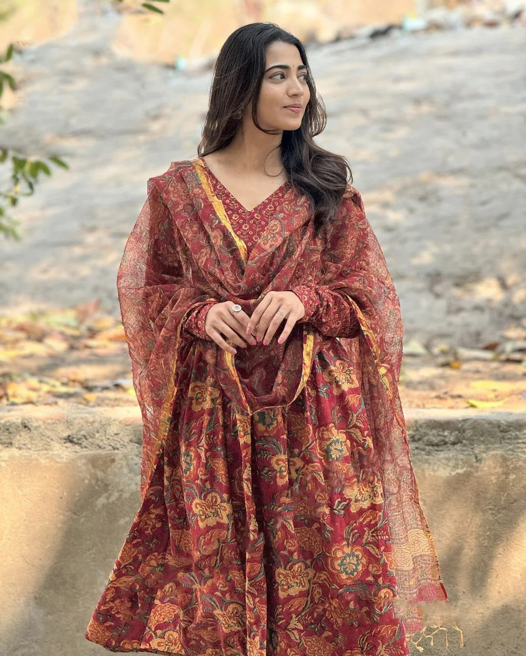 Wrap yourself in the warm elegance of the Rust Rosewood Viscose Suit Set. Crafted from breathable and lightweight viscose fabric, this suit set showcases a beautiful blend of traditional florals in rich rust, maroon, and earthy green tones. The kurta features a timeless straight-cut silhouette with a V-neckline, while the complementing dupatta adds an airy charm with its sheer texture and delicate border work.