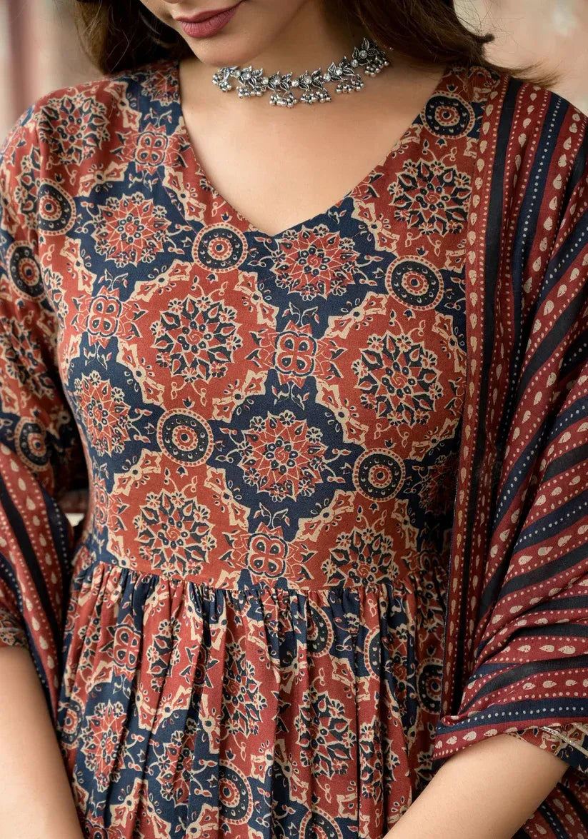 Unveil your love for earthy tones with the Rustwood Anarkali Charm Set. Crafted from breathable viscose fabric, this elegant ensemble features a flared Anarkali kurta adorned with intricate ethnic prints in warm rust, brown, and indigo hues. Paired with matching straight pants and a coordinated printed dupatta, it brings effortless grace to your festive days, casual outings, or cultural gatherings.