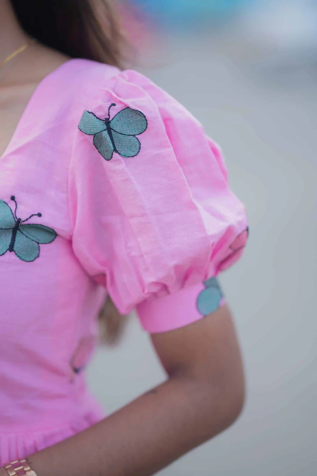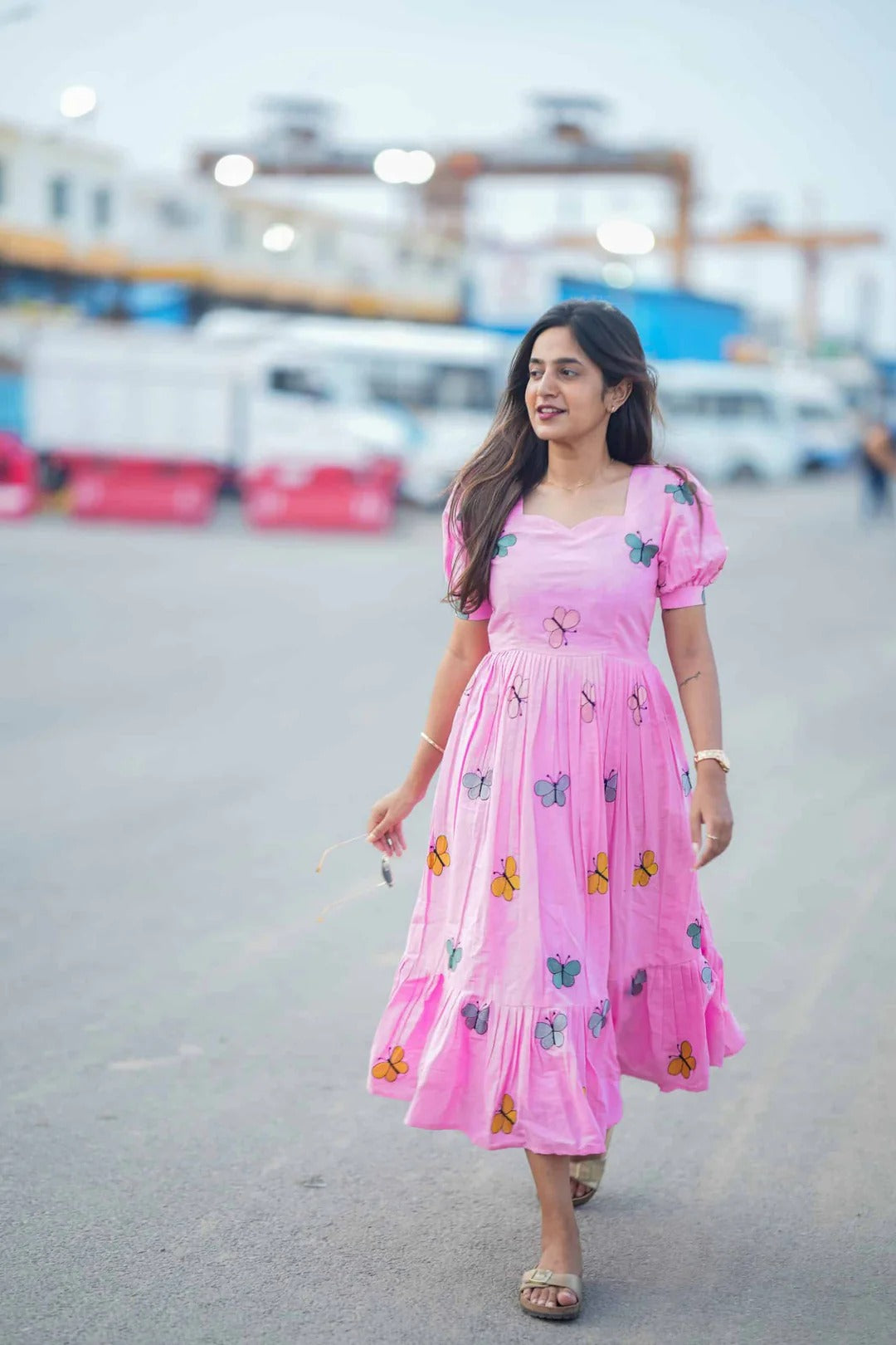 Frock Fabric - Baby Pink Mul Cotton Frock With Butterfly Embroidery Allover.