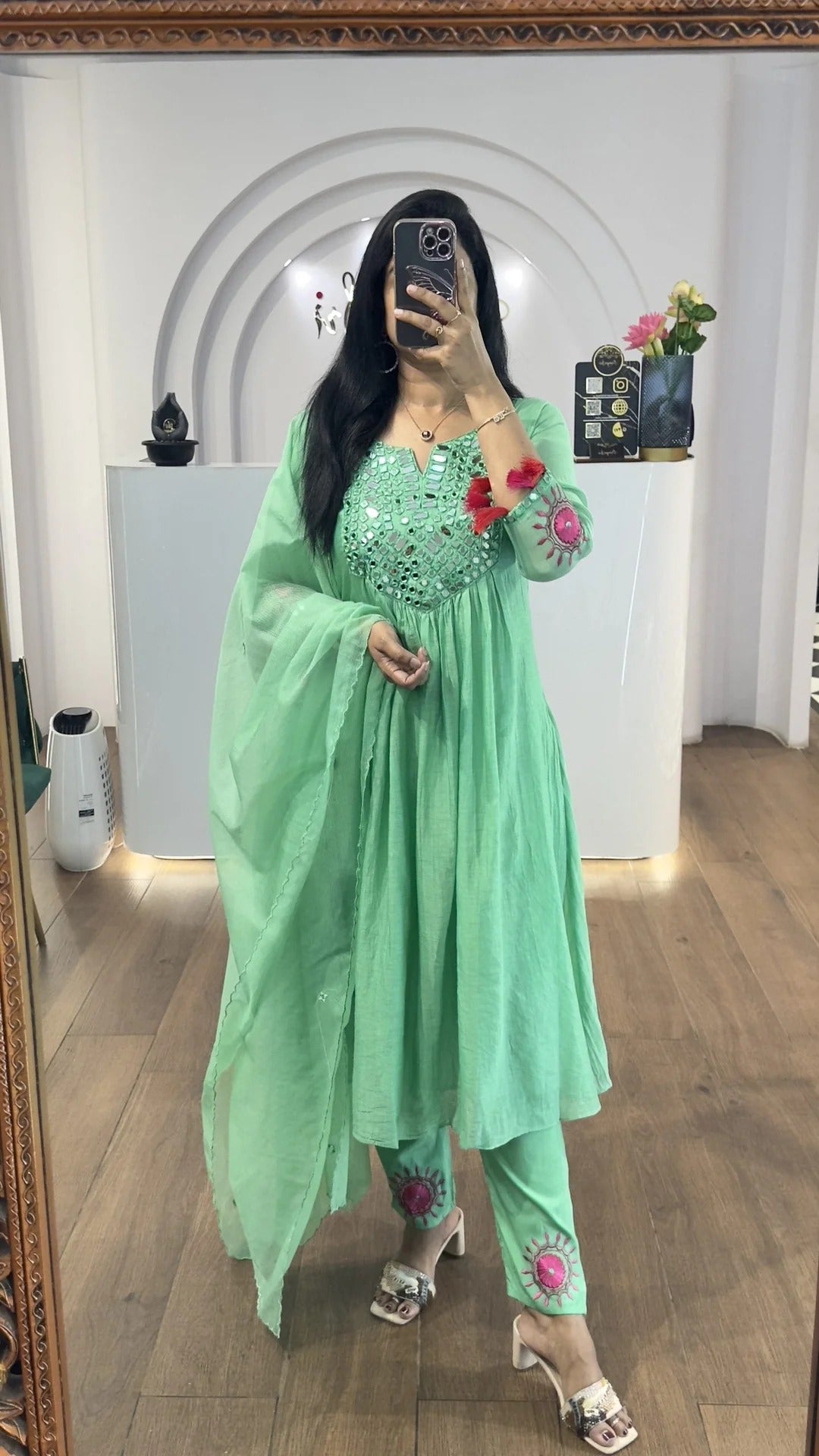 Sea Green Mul Chanderi Mirrors Handwork Suit Set